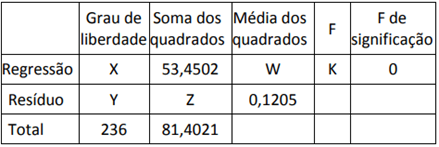 b) Complete na tabela ANOVA os valores representados por X, Y, Z, W e K.