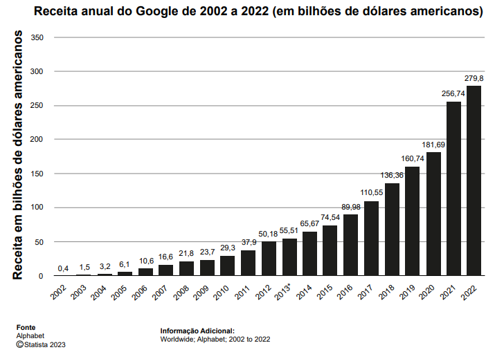 A concentração da publicidade e do público em plataformas do Google (especialmente o buscador e o Youtube) e do Meta, além do Tik Tok, mudou o panorama da comunicação. Considerando a produção e a divulgação de notícias e informações nesse cenário, tanto por parte do jornalismo profissional quanto por órgãos públicos, e levando em conta o Gráfico da receita anual do Google e o trecho do relatório do Instituto Reuters, redija um texto dissertativo contínuo de 35 a 45 linhas que aborde e relacione criticamente os seguintes aspectos: