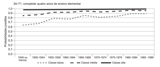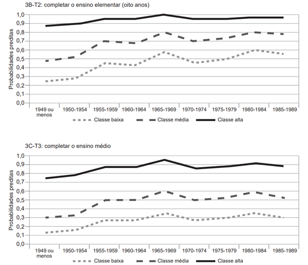 As tendências da desigualdade de oportunidades educacionais, em termos das características socioeconômicas das famílias de origem, de acordo com as probabilidades preditas pelo modelo para indivíduos em três grupos socioeconômicos são: i) classe baixa (indivíduos cujos pais tinham menos de quatro anos de estudo e status ocupacional equivalente ao de um trabalhador manual não qualificado); ii) classe média (indivíduos cujos pais tinham ensino elementar completo – oito anos – e status ocupacional equivalente ao de um trabalhador não manual de rotina); e iii) classe alta (indivíduos cujos pais tinham algum ensino superior e status ocupacional equivalente ao de um profissional).
