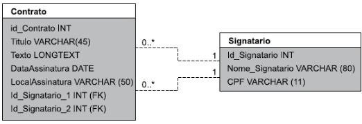 a) Uma limitação desse modelo é que um contrato só pode ser assinado por dois signatários. Entretanto, existem contratos que são assinados por mais de duas partes. Proponha modificações no modelo para que ele passe a suportar um número arbitrário de signatários por contrato, sem impor um limite superior. Detalhe sua resposta precisamente, indicando as tabelas, colunas e relacionamentos do modelo modificado.