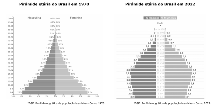 A partir da comparação das pirâmides etárias dos anos de 1970 e de 2022, apresentadas acima, redija um texto dissertativo acerca dos impactos das tendências demográficas brasileiras e do novo regime demográfico para este século. Ao elaborar seu texto, aborde os seguintes aspectos: