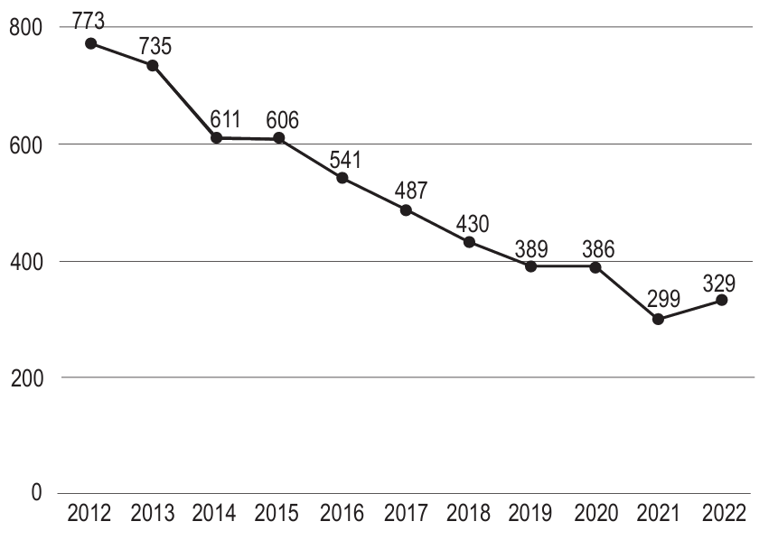 Ao longo dos últimos oito anos, uma entidade autárquica, cujas atividades são custeadas com recursos do orçamento do ministério ao qual está subordinada, sofreu severos cortes de recursos em seu orçamento discricionário, conforme ilustrado no gráfico a seguir (eixo x: ano; eixo y: orçamento discricionário, com valores expressos em milhões de reais):