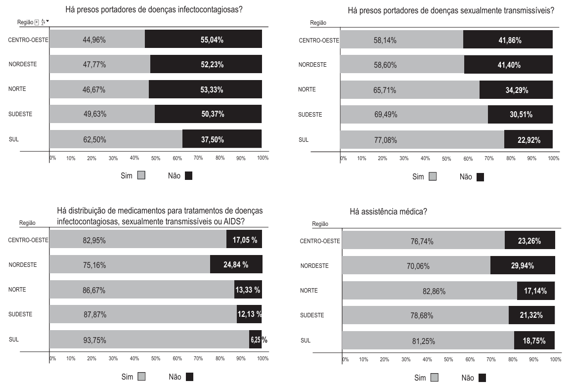 Em uma análise dos gráficos, observa-se o elevado adoecimento da população prisional em contraste com os percentuais de distribuição de medicamentos e assistência médica, por exemplo. Frente aos dilemas na implementação da PNAISP, redija um texto dissertativo contínuo de 35 a 40 linhas sobre a situação descrita analisando:
