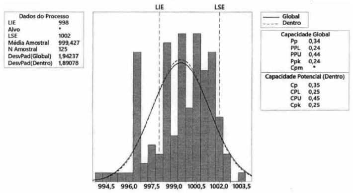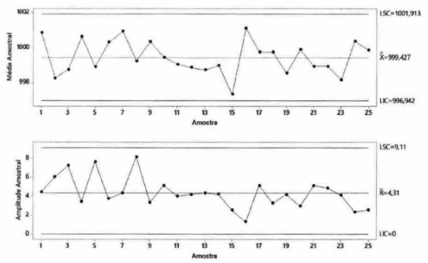 O peso líquido de garrafas de água (em mililitros) deve ser monitorado pelos gráficos de controle usando amostras de tamanho n = 5. O limite de especificação inferior é 998 ml, enquanto que o limite superior de especificação é 1002 ml. O gráfico de controle e o gráfico de capabilidade constam nas figuras a seguir.