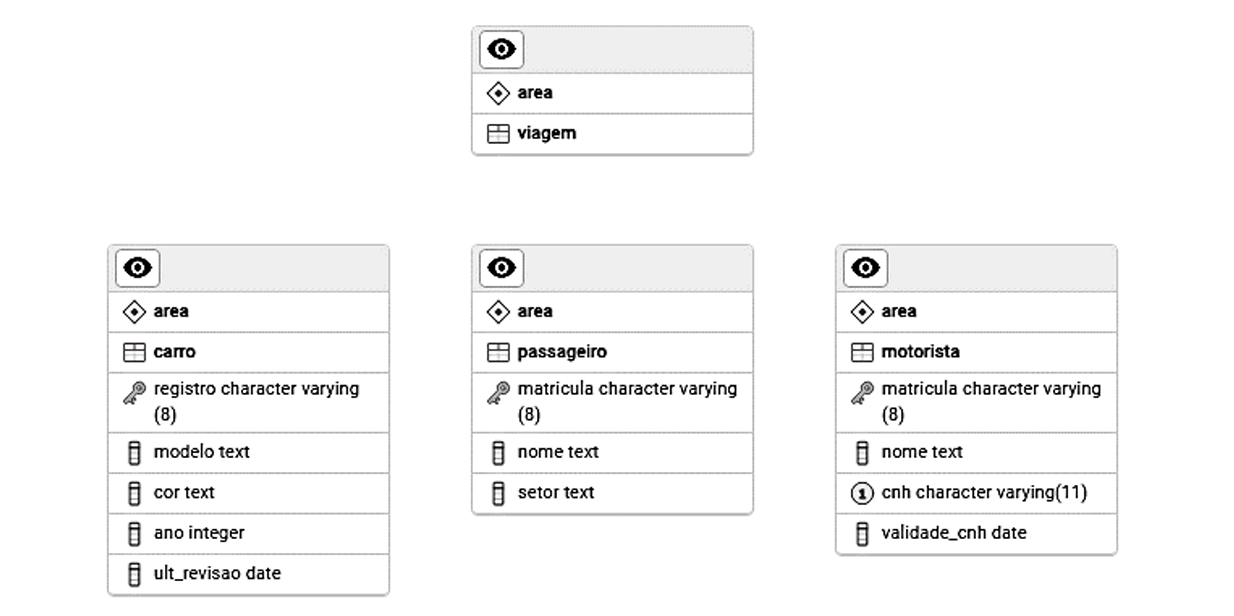 No modelo relacional ilustrado na figura acima, a tabela viagem deverá armazenar informações sobre as viagens realizadas a serviço, incluindo o carro utilizado, o motorista responsável e a pessoa a ser transportada. Devem ser ainda registrados detalhes como o destino, data e hora do início e do fim da viagem, preservando a consistência temporal dos valores referentes ao início e ao fim da viagem.