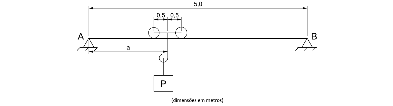 Um engenheiro mecânico é solicitado a avaliar a resistência estrutural de uma viga utilizada em um guindaste pórtico. Essa viga tem comprimento de 5,0m e iça uma carga de peso P utilizando um carrinho que desliza livremente sobre a viga. O sistema descrito é esquematicamente ilustrado a seguir.