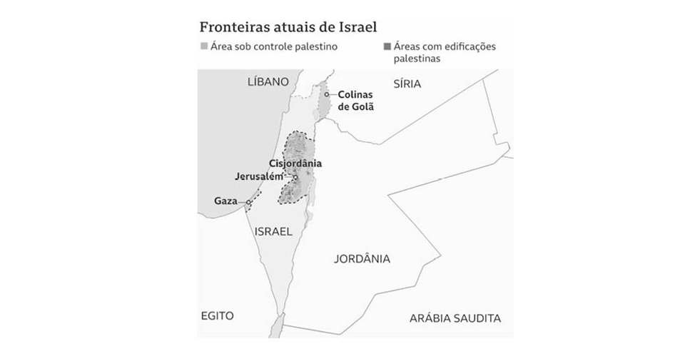 Recorte de parte do Oriente Médio, com a divisão atual e destaque para a Palestina e sua delimitação territorial, apontando o Estado de Israel, as Colinas de Golã (domínio israelense), a Faixa de Gaza e a Cisjordânia, além da localização da cidade de Jerusalém.