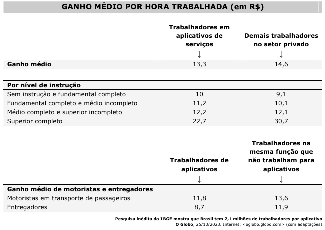 O IBGE fez, pela primeira vez, um levantamento dos brasileiros que trabalham para aplicativos e identificou 2,1 milhões de trabalhadores que obtêm sua principal fonte de renda nessas plataformas. Desse total, 1,5 milhão atua como motorista de serviços de passageiros ou entregador de comida e produtos. São homens em sua imensa maioria (81,3%), com escolaridade elevada (61,3% têm ensino médio completo ou ensino superior incompleto) e jovens (48,4% têm entre 25 e 39 anos de idade).
