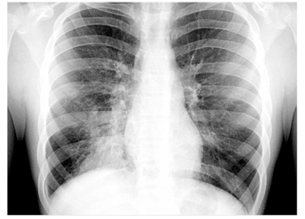 Um paciente de 43 anos de idade, sem comorbidades, alergias ou tratamentos no último ano, apresenta quadro de adinamia, anorexia, picos febris (até 38,5 °C), tosse produtiva com escarro purulento e cansaço aos esforços há dois dias. No exame físico, encontrava-se febril, acianótico, com frequência cardíaca de 108 bpm, frequência respiratória de 21 irpm, saturação de oxigênio em ar ambiente de 95% e pressão arterial de 126 mmHg × 78 mmHg. A ausculta pulmonar revelou estertores crepitantes em terço inferior do pulmão direito. O restante do exame físico não revelou alterações significativas. Os resultados de hemograma realizado indicaram 13.000 leucócitos, sem desvio à esquerda, ureia de 36 mg/dL e creatinina de 0,9 mg/dL. O paciente foi submetido a radiografia de tórax, cujo resultado está apresentado a seguir.