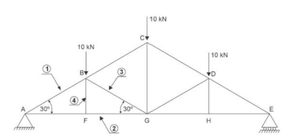 A treliça está submetida a três cargas concentradas de 10 kN cada nos nós B, C e D.