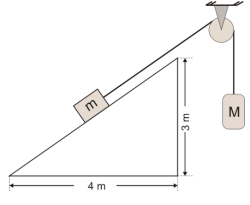 A massa do bloco que está apoiado na rampa é m = 15 kg, a do bloco que está suspenso pelo fio é M = 14 kg, o fio e a roldana são ideais e o trecho do fio que liga o bloco apoiado à roldana é paralelo a rampa, cujas dimensões estão indicadas. Considere g = 10 m/s2.