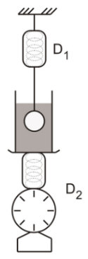 Uma esfera maciça de 2 L está suspensa por um fio ideal de volume desprezível a um dinamômetro D1. A esfera está totalmente submersa na água contida num recipiente. O recipiente (com água) encontra-se sobre outro dinamômetro D2, como mostra a figura. Estando todo o sistema em equilíbrio, o dinamômetro D1 indica 140 N e o dinamômetro D2 indica 220 N.