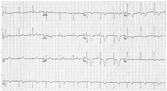 Uma paciente de 79 anos de idade compareceu à emergência hospitalar com queixa de dispneia ao repouso havia três horas, sem fatores desencadeantes ou de alívio, e negou episódios semelhantes prévios. Relatou que recebera diagnóstico de hipertensão arterial sistêmica e diabetes do tipo 2 havia 20 anos, tratados atualmente com anlodipino 10 mg e metformina 1.500 mg, respectivamente. Ao exame físico, encontrava-se acianótica, com pressão arterial de 134 × 78 mm/Hg, frequência cardíaca de 78 bpm, saturação de oxigênio em ar ambiente de 94%, ritmo cardíaco regular em dois tempos sem sopros, com discretos estertores crepitantes em bases pulmonares. O restante do exame físico mostrou resultado normal. À análise dos exames laboratoriais de rotina, verificou-se dosagem da troponina T ultrassensível igual a 0,03 ng/mL (valor de referência < 0,01 ng/mL), tendo sido os demais resultados normais. A paciente submeteu-se a eletrocardiograma (com calibração padrão), demonstrado a seguir.