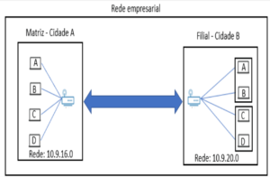 Uma empresa está implementando um projeto de interconexão de suas redes locais entre sua matriz e filial, as quais residem em cidades diferentes, como forma de agilizar o trâmite de informações e documentos entre elas. O objetivo do projeto é que matriz e filial tenham acesso à mesma rede, conforme figura a seguir.
