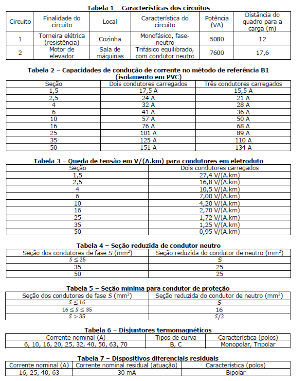 D) Com base nos critérios de capacidade de corrente e de queda de tensão (itens B e C), especifique o(s) condutor(es) de fase, neutro e proteção para os dois circuitos. As Tabelas 4 e 5 apresentam características para os condutores de neutro e proteção. Justifique suas escolhas.