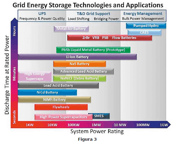 Na Figura 3, várias tecnologias de armazenamento de energia estão representadas. Para fins de melhor compreensão, estão presentes no gráfico: