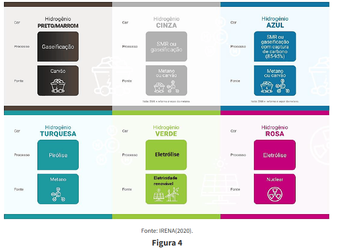Para classificar os diferentes métodos de obtenção, a Agência Internacional de Energia (IEA) classifica o hidrogênio em diferentes cores, cada uma representando uma tecnologia de produção específica (Figura 4):