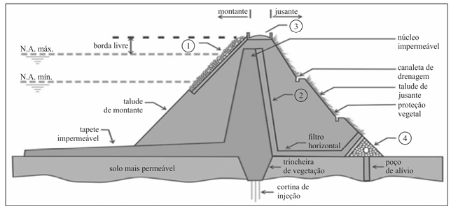 Os principais critérios de classificação de uma barragem estão relacionados à finalidade, ao porte e ao material utilizado em sua construção. Diversos fatores influenciam na tomada de decisão acerca dos materiais adotados em um projeto como esse. Da mesma forma, os elementos que constituem a barragem configuram respostas às necessidades técnicas, sociais e ambientais para a execução e operação do empreendimento. A figura a seguir apresenta a seção transversal de uma barragem projetada para o armazenamento de água destinada ao abastecimento público.