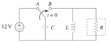 Em um projeto do circuito de ignição do airbag de automóveis, será utilizado o esquema ilustrado a seguir. Considere que, para o tempo t < 0, a chave encontra-se na posição A; se um automóvel colide, em t = 0 um pêndulo gera contato com um relê, o qual comuta a chave para a posição B, alimentando, então, o restante do circuito; o airbag deve ser acionado em tempo inferior a 0,1 segundo após a comutação da c h ave, a fim de que o airbag seja inflado; a energia dissipada em R, cuja resistência equivale a 4 Ω, deverá ser, pelo menos, igual a 1 J; para t ≥≥ 0, a resposta do circuito deverá ser subamortecida.