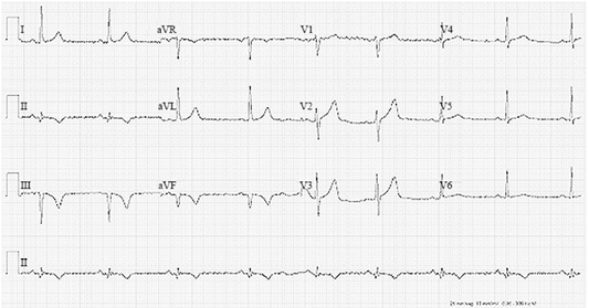O eletrocardiograma de duas semanas atrás pode ser visto a seguir. O ecocardiograma revelou fração de ejeção do ventrículo esquerdo de 38%.