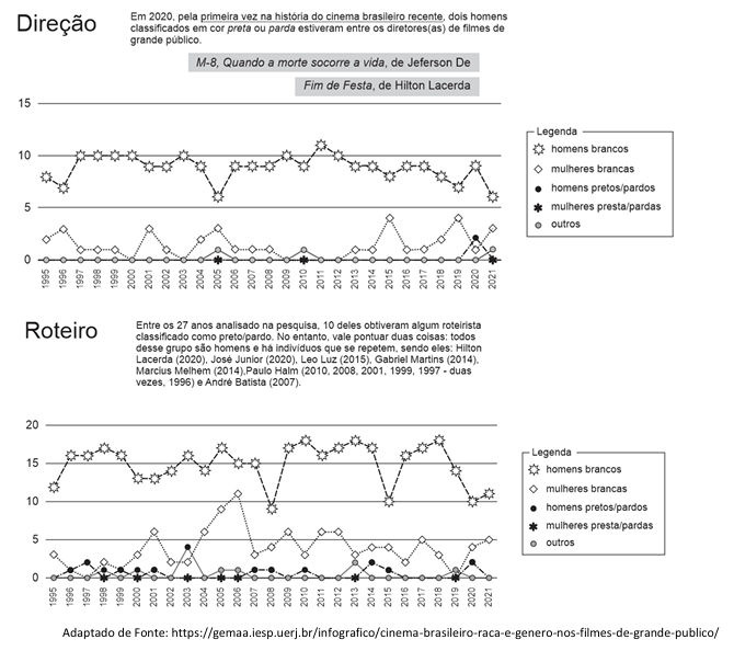 Em 2022, o Grupo de Estudos Multidisciplinares da Ação Afirmativa (Gemaa) divulgou seu estudo sobre as desigualdades nos filmes de grande público produzidos no Brasil entre 1995 e 2021: nenhuma mulher negra dirigiu ou roteirizou filmes de grande público em décadas de produção audiovisual nacional e apenas dois homens negros foram identificados como diretores em 2020.