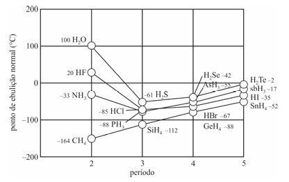 A fim de instigar os estudantes de ensino médio a elaborar uma explicação racional para um fenômeno observado, um professor apresentou à turma o gráfico acima, que ilustra a evolução dos pontos de ebulição dos compostos binários de hidrogênio dos elementos dos grupos de 14 a 17 da tabela periódica. A tendência verificada no grupo 14 é o que se deveria esperar para compostos semelhantes que diferem em número de elétrons: os pontos de ebulição aumentam conforme se avança de cima para baixo no respectivo grupo porque a intensidade da interação de London aumenta. No entanto, a amônia, a água e o fluoreto de hidrogênio apresentam comportamentos anômalos, exibindo pontos de ebulição excepcionalmente altos.