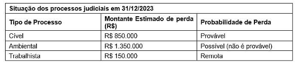 No encerramento do exercício de 31/12/2023, a CODERN, empresa pública federal, avaliou o seguinte conjunto de processos judiciais: