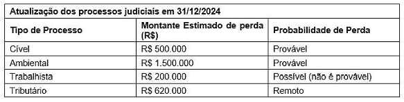 Em 31/12/2024, a assessoria jurídica da empresa atualizou a avaliação e incluiu um novo processo: