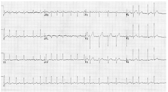 Os exames laboratoriais de rotina e os marcadores de necrose miocárdica não evidenciaram alterações significativas. O eletrocardiograma é mostrado a seguir.