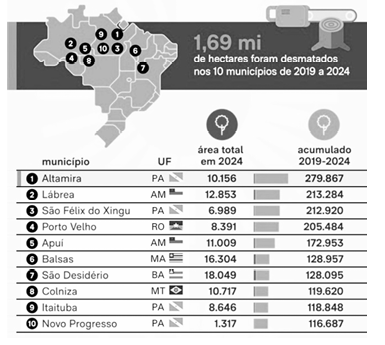 “A maior parte das áreas desmatadas está localizada na região Norte. No período de 2019 a 2024, foram desmatados 1,69 milhão de hectares nos dez municípios; com isso, houve aumento da produção agrícola pelo aumento do desmatamento, o que indica que a agropecuária nesses municípios é altamente…