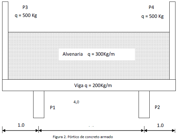 A figura 2 representa um pórtico em concreto armado com uma alvenaria erguida sobre a viga. O sistema é composto por quatro pilares P1, P2, P3 e P4, e uma viga. As cargas (q) dos pilares P3 (esquerda da viga) e P4 (direita da viga), da viga e da alvenaria estão apresentadas na figura. As dimensões do sistema estão em metros.