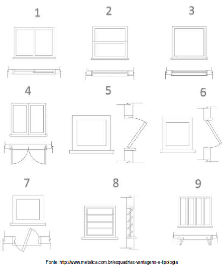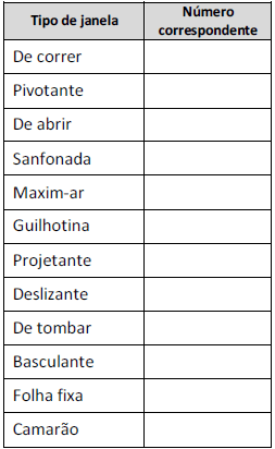 Analise as figuras abaixo e indique a que tipo de esquadria cada número representa, fazendo a associação na tabela a seguir.