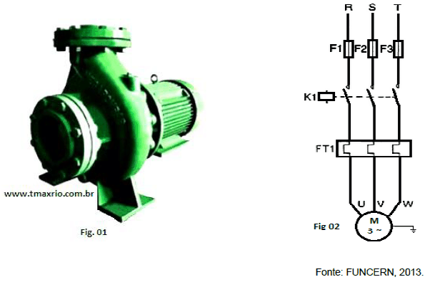 A figura 01 apresenta um motor elétrico trifásico acoplado a uma bomba centrífuga. Esse conjunto, motor-bomba será instalado num poço da CAERN. O circuito de potência para acionamento do motor, em partida direta através de contator, é apresentado na figura 02. Elabore, desenhando, o circuito de comando para o sistema de partida de modo que o acionamento (ligar e desligar através de botoeiras pulsadoras) possa ser realizado de dois locais distintos.