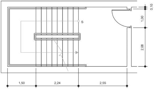 d. Indicar, em escala aproximada, sobre o desenho apresentado abaixo, − que corresponde a uma das escadas existentes no edifício e que será utilizada como saída de emergência e rota de fuga −, três diferentes elementos que deverão ser obrigatoriamente previstos e instalados para a sua correta utilização.