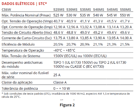 Dimensione adequadamente o sistema fotovoltaico com base nos dados fornecidos pelo fabricante dos painéis solares (Figura 2) e considerando os seguintes dados para o projeto: