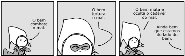 A partir da “tirinha” acima, redija uma dissertação sobre a violência promovida por particulares e pelo Estado supostamente para combater o crime, bem como sobre a atuação do Ministério Público diante de tais condutas, à luz do perfil conferido à Instituição pela Constituição da República Federativa do Brasil de 1988.