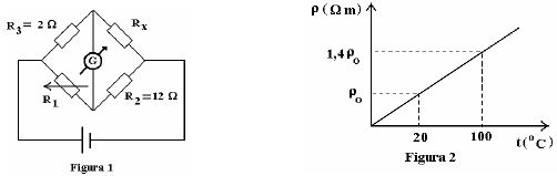Um resistor Rx é mergulhado num reservatório de óleo isolante. A fim de estudar a variação da temperatura do reservatório, o circuito de uma ponte de Wheatstone foi montado, conforme mostra a figura 1. Sabe-se que Rx é um resistor de fio metálico de 10m de comprimento, área da seção transversal de 0,1 mm2, e resistividade elétrica ρo de 2,0 x 10-8 Ω m, a 20 ºC. O comportamento da resistividade ρ versus temperatura t é mostrado na figura 2. Sabendo-se que o resistor Rx foi variado entre os valores de 10Ω e 12Ω para que o circuito permanecesse em equilibrio, determine a variação da temperatura nesse reservatório.