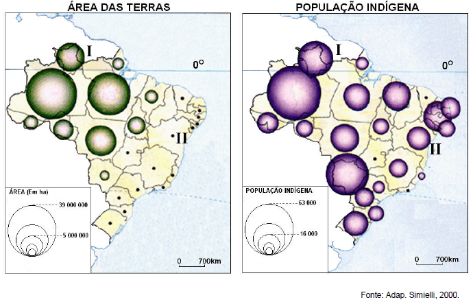 a) Analise a relação entre a área das terras e as populações indígenas nas regiões I e II.