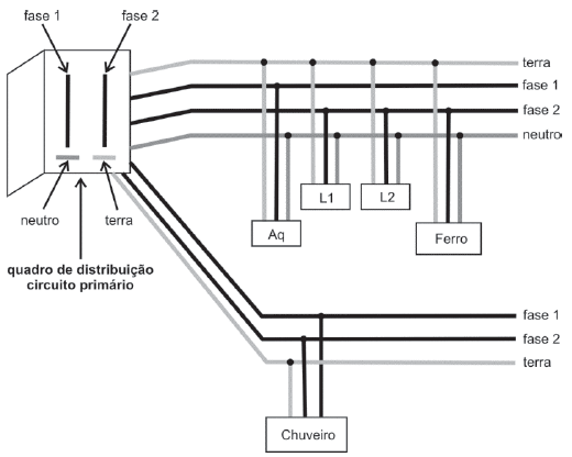 b) a corrente elétrica que percorre cada um dos fios fase, no circuito primário do quadro de distribuição, com todos os equipamentos, inclusive o chuveiro, ligados;