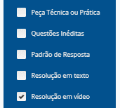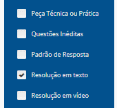 Para filtrar as questões que possuem resolução em vídeo, bastar marcar no filtro a opção “Resolução em vídeo”, conforme imagem abaixo:
