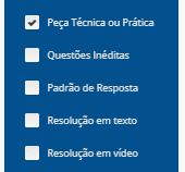Para filtrar as questões que são classificadas como peças técnicas ou práticas, bastar marcar no filtro a opção “Peça Técnica ou Prática”, conforme imagem abaixo: